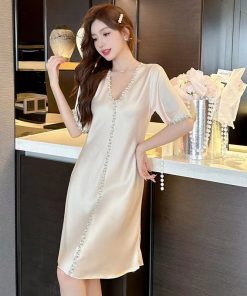 Sẵn Alisa Premium Ice Silk Pyjama Váy ngủ cổ chữ V mặc ở nhà-thoitrangcenter