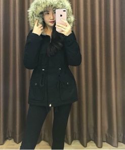 Sẵn Áo Khoác Parka Lót Lông Cừu Nữ Dây Rút eo Mũ hàn quốc mùa đông ấm áp-thoitrangcenter