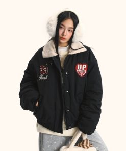 Sẵn Tianlesiwei Mùa đông nam nữ thêu dày áo khoác bóng chày kiểu Mỹ cổ cừu cổ điển áo khoác cotton-thoitrangcenter