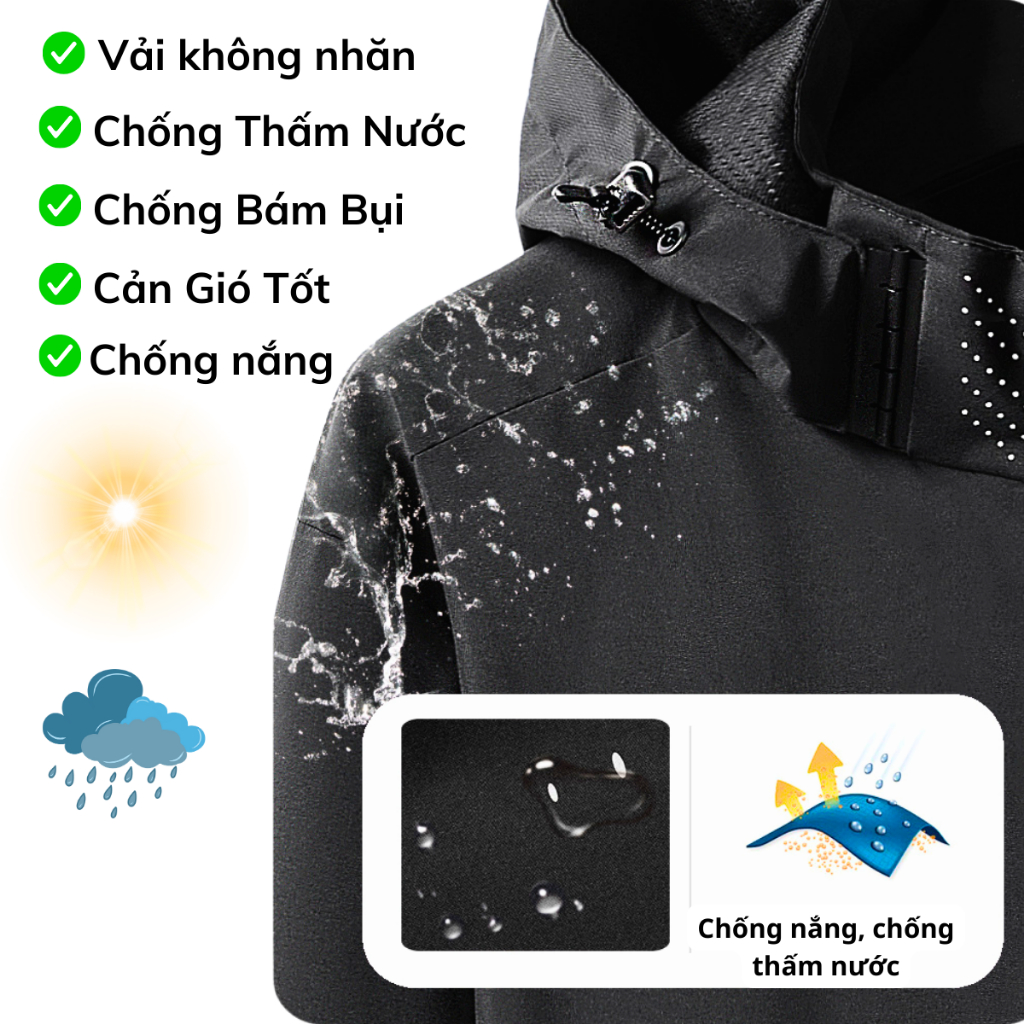 Chống thấm nước: Lớp vải chống thấm giúp bạn yên tâm trong những ngày mưa nhẹ, giữ cho cơ thể luôn khô ráo.
