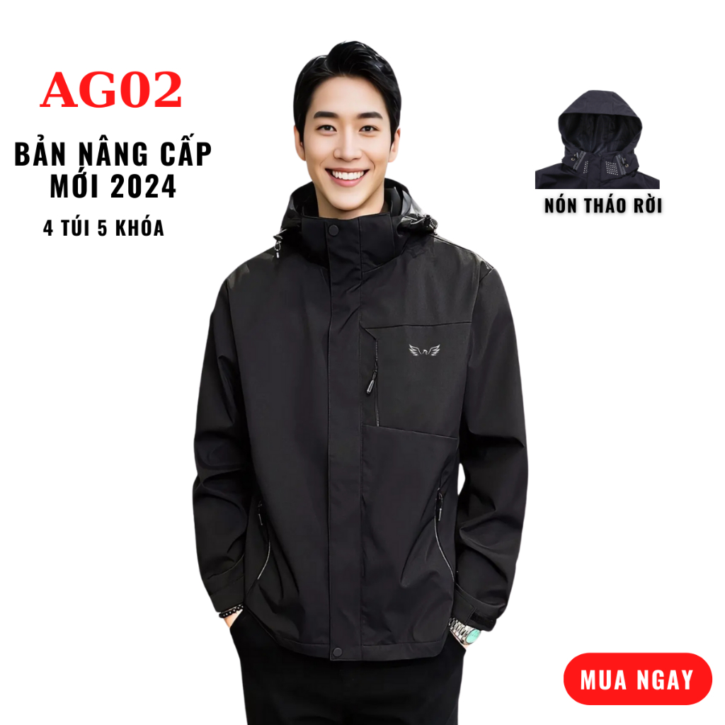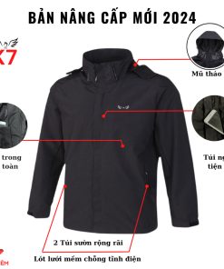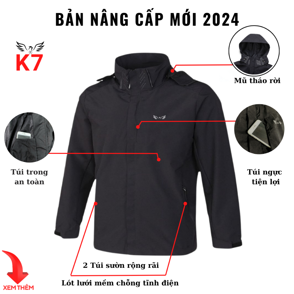 Áo Khoác Nam Nữ Không Nhăn Chống Thấm Nước K7 2025, Lót Lưới 4 túi 5 Khóa, Mũ Tháo Rời, Áo Khoác Ngoài, Jacket Menswear Màu Đen Có Túi