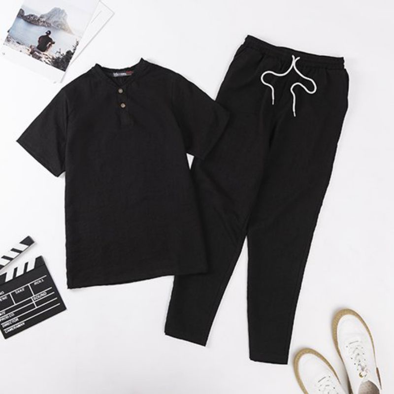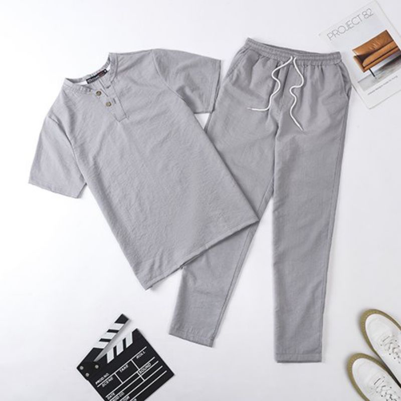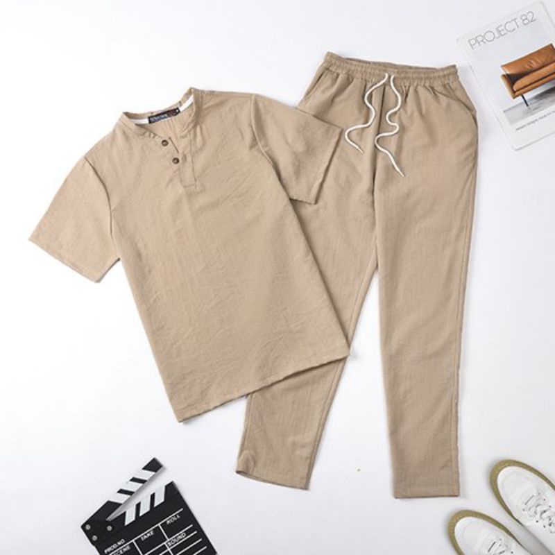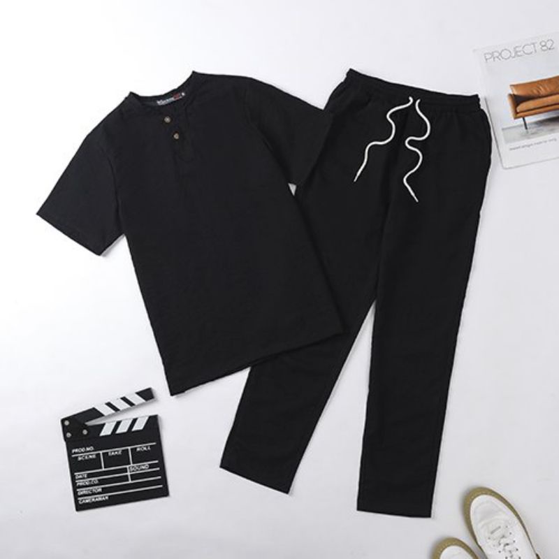 Bộ Đũi Nam Cổ V Chất Liệu Vải Đũi Mềm Mát Màu Đen Xám Tím Than Be Tay Ngắn Quần Dài Phong Cách Thời Trang Hàn Quốc Thời Trang Center