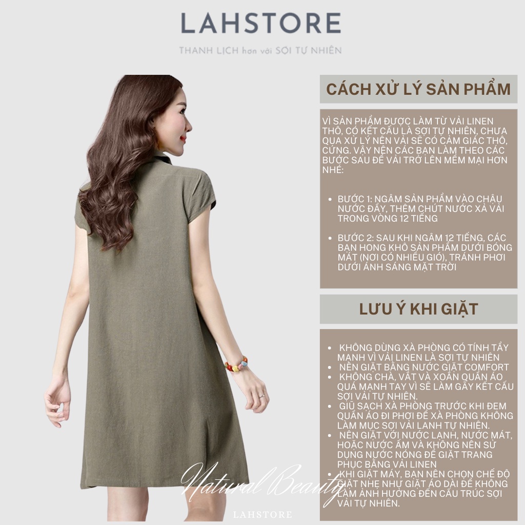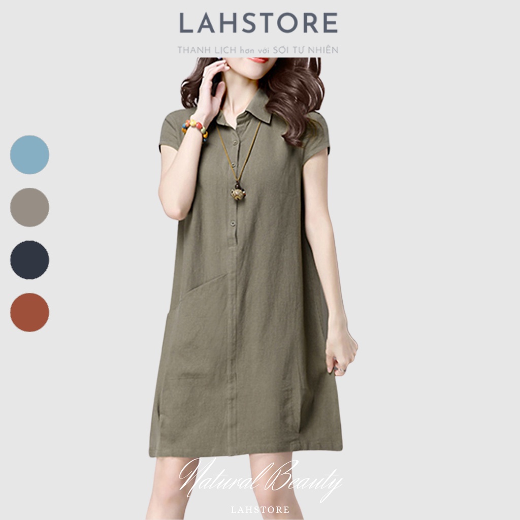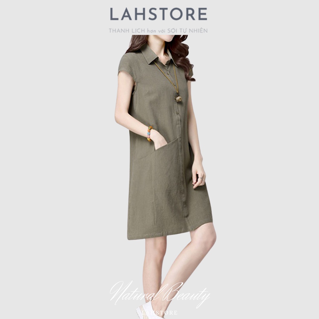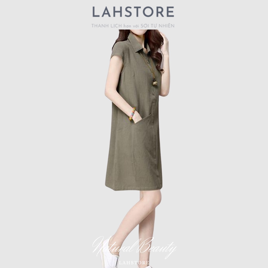 Đầm suông cổ sơ mi LAHSTORE vải đũi mềm mát thiết kế túi bên hông trẻ trung sang trọng (Xanh Rêu)