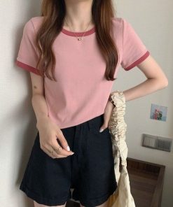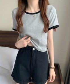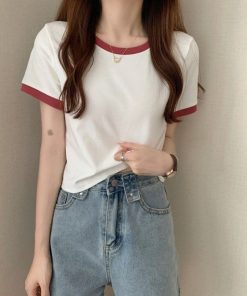 Mùa hè phiên bản Hàn Quốc mới tương phản màu cổ tròn áo phông tay ngắn áo lót nữ sửa thân áo ngắn Thời Trang Center