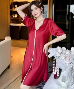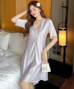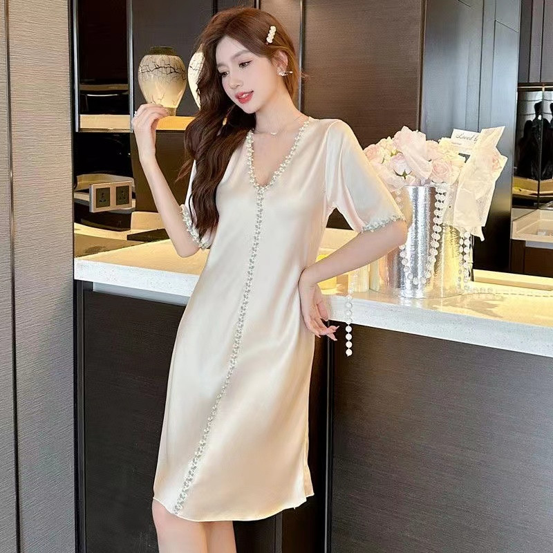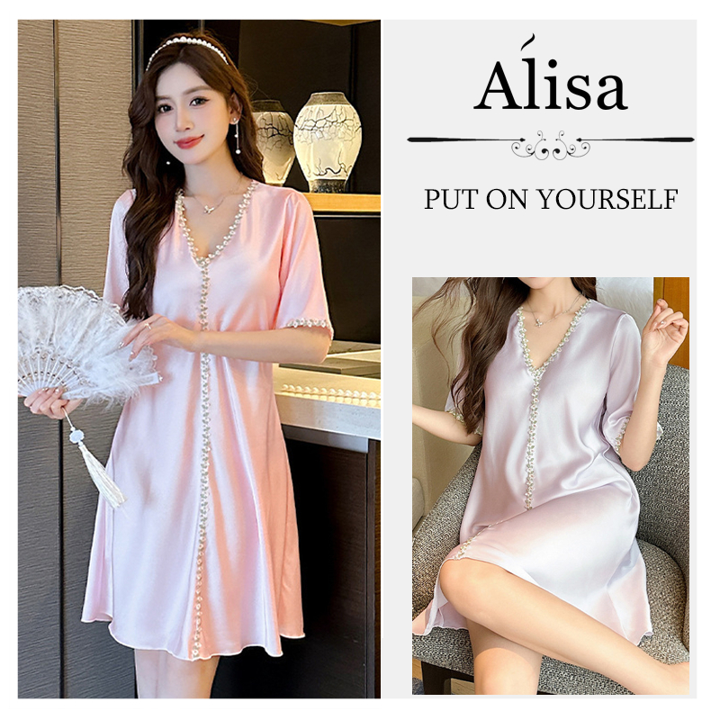 Alisa Premium Ice Silk Pyjama Váy ngủ cổ chữ V mặc ở nhà Thời Trang Center