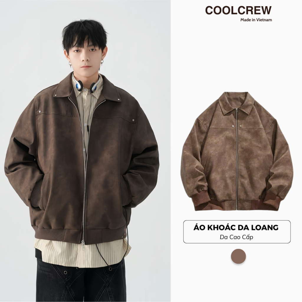 Áo Khoác Da Loang Nâu Unisex Cổ Bẻ Khóa Kéo Phong Cách Retro Đường Phố Thời Trang Center