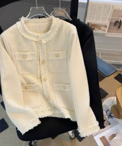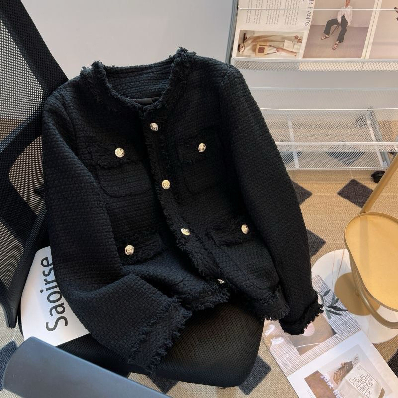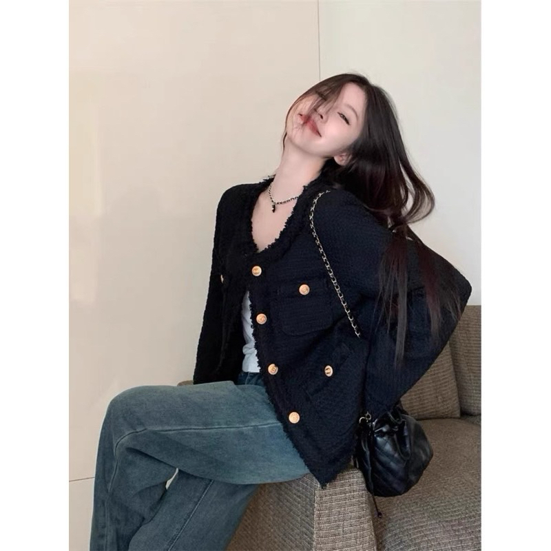 Áo Khoác Dạ Tweed Tiểu Thư Cúc Vàng Cổ Tròn Viên Tua Rua