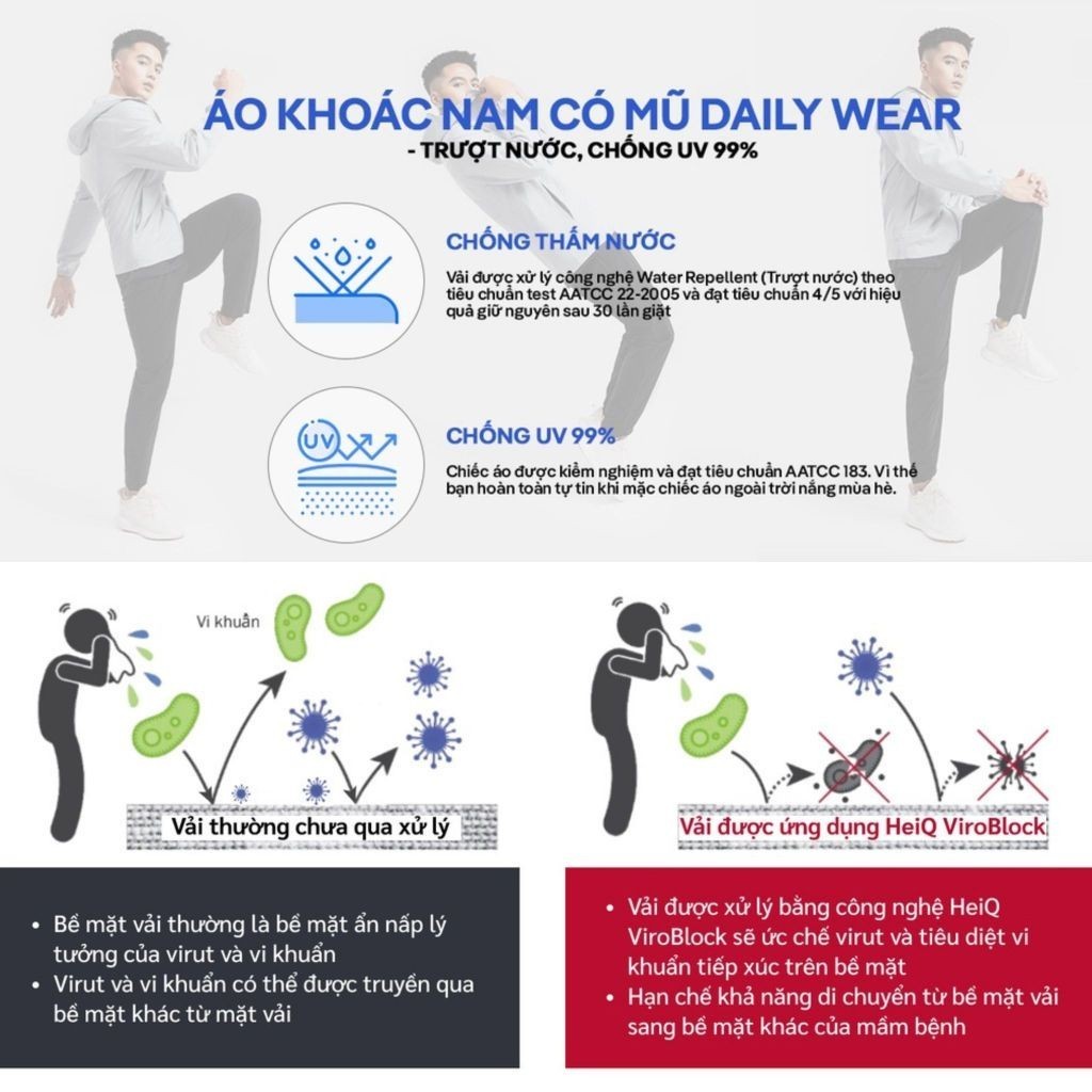Với chiếc áo khoác nam có mũ Daily Wear bạn sẽ không còn lo lắng đến việc mặc chiếc áo này chạy bộ có bị mùi mồ hôi không, hay đi mưa ướt chiếc áo của bạn vẫn luôn đảm bảo sẽ không bị các mùi khó chịu, ẩm mốc.