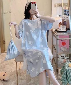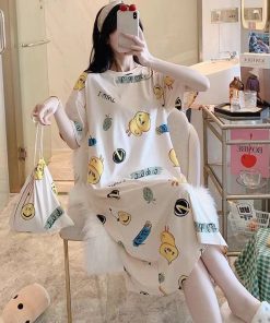 Váy ngủ tay ngắn, Cotton, họa tiết hoạt hình mát mẻ, dễ thương