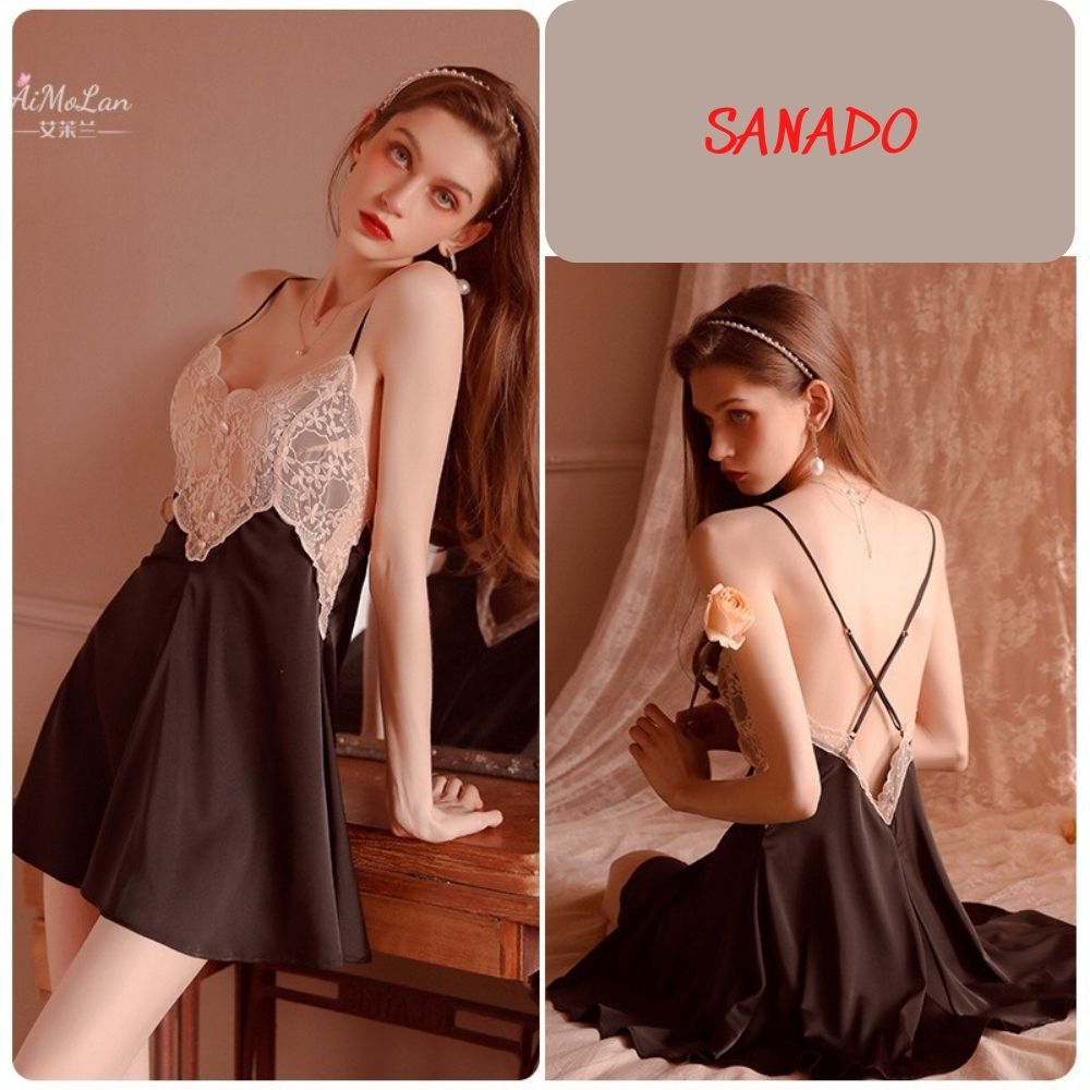 Sẵn Đầm ngủ SANADO đồ ngủ lụa phối ren cao cấp gợi cảm quyến rũ V06-thoitrangcenter