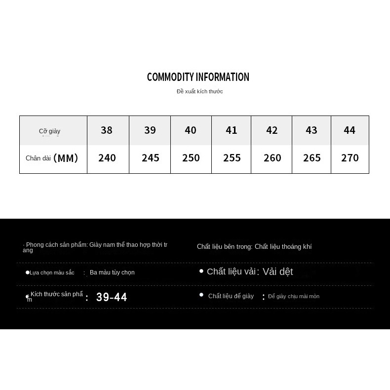 Kích thước: 39, 40, 41, 42, 43, 44