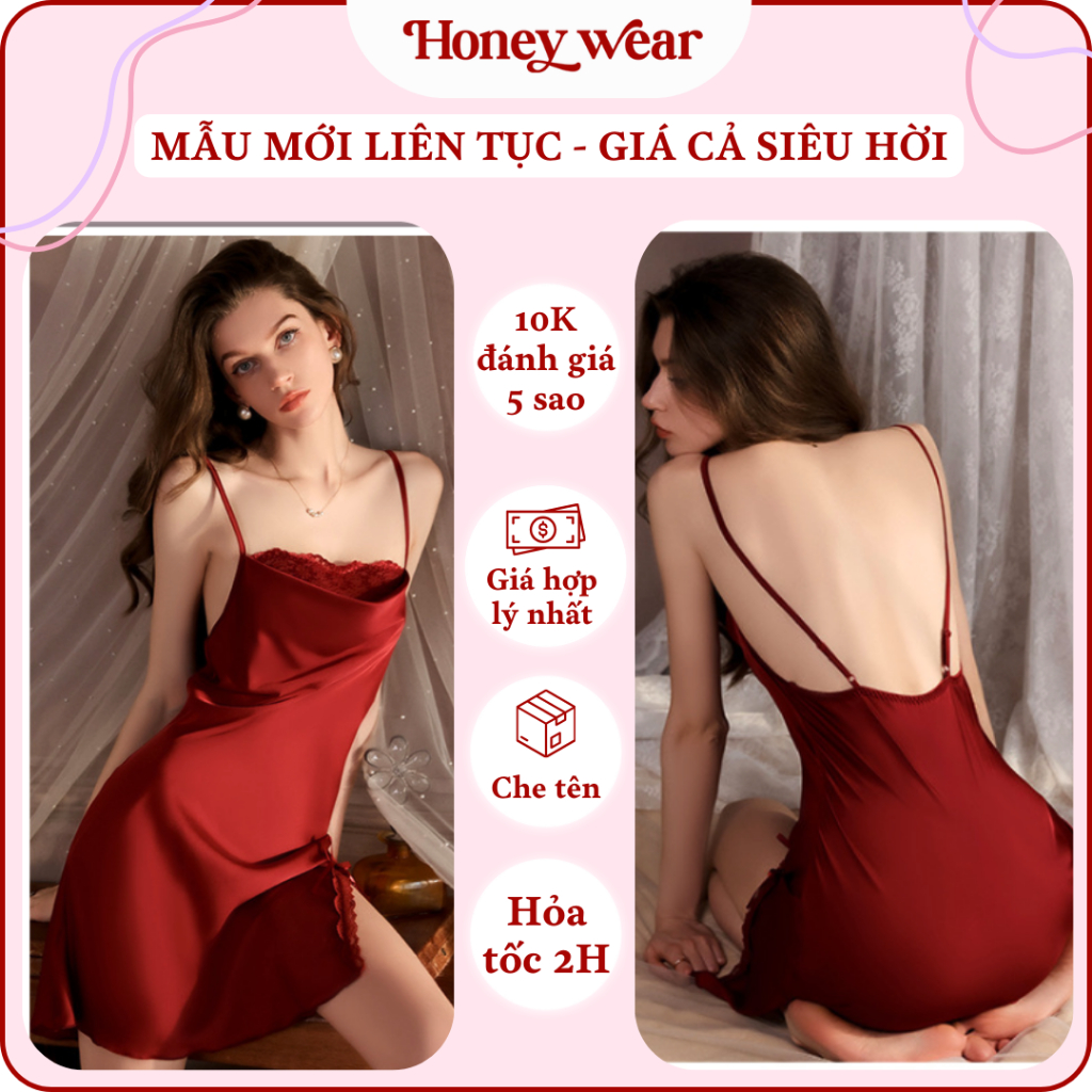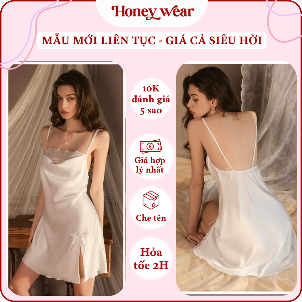 Tên sản phẩm: Đồ Ngủ Nữ, Váy Ngủ Lụa Hai Dây Cổ Đổ Phối Ren Honey Wear Đầm Ngủ Lụa Sexy, Gợi Cảm A141