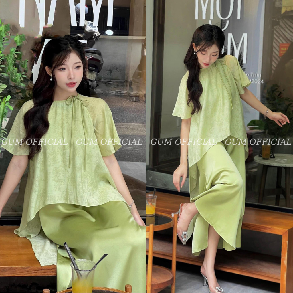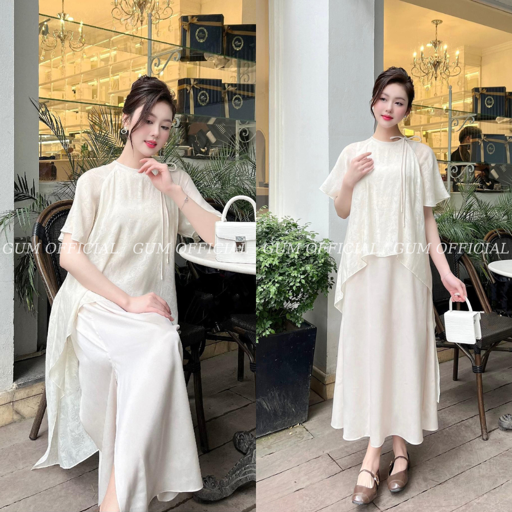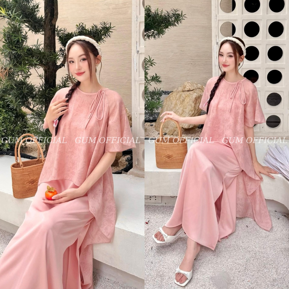 Set cách tân Hạ An , Váy Thiết Kế Dáng Suông Vải Tơ In Hoa Phối Lụa Buộc Nơ Thanh Lịch Gum Official -SB004-thoitrangcenter