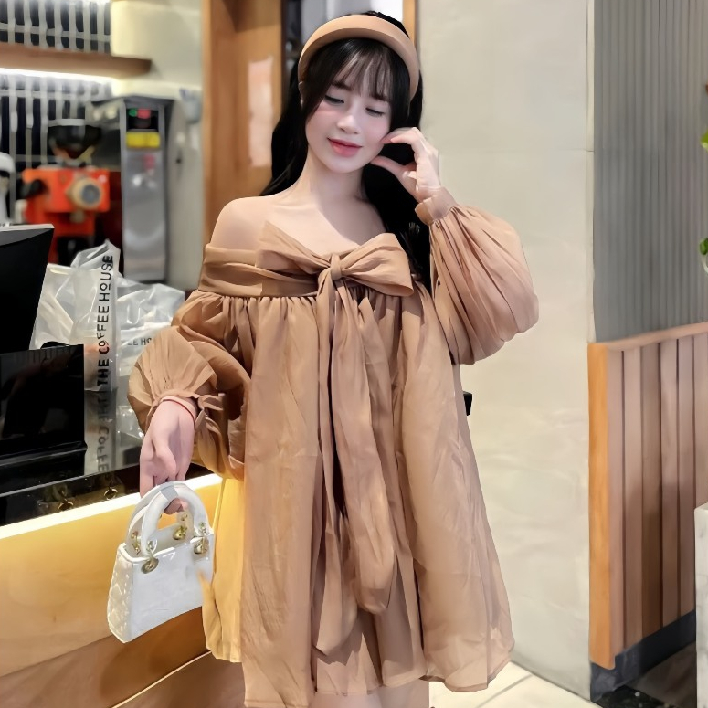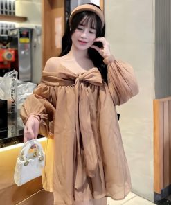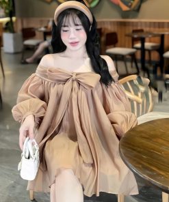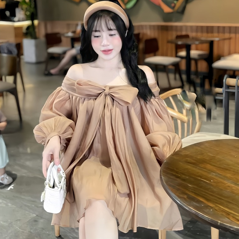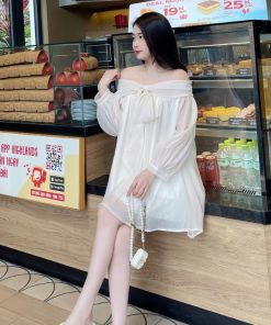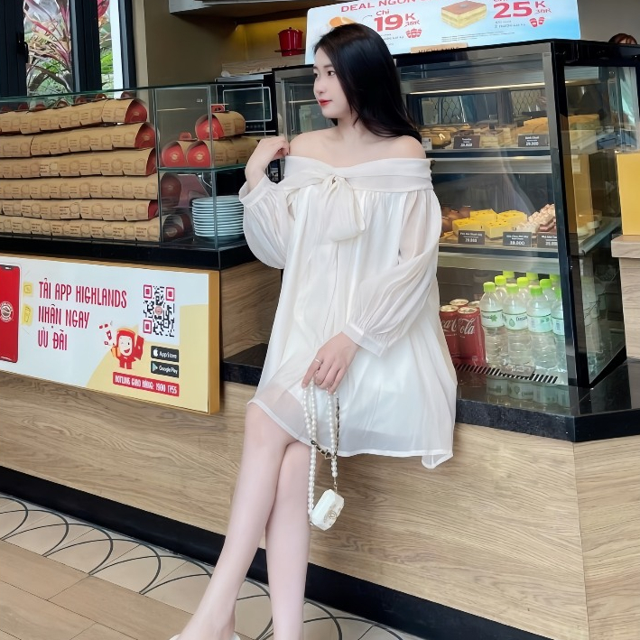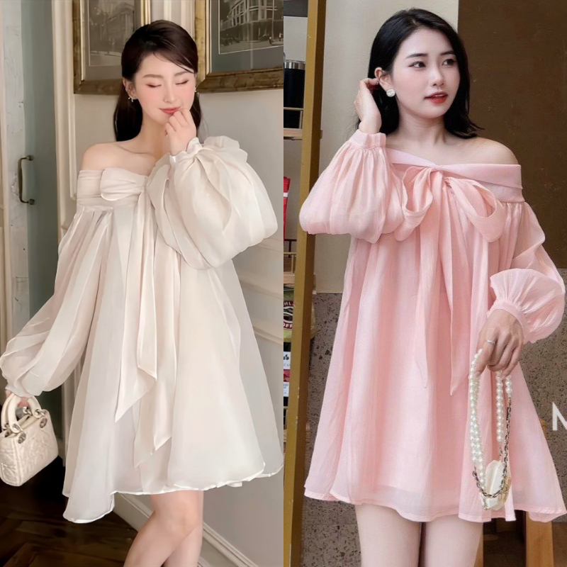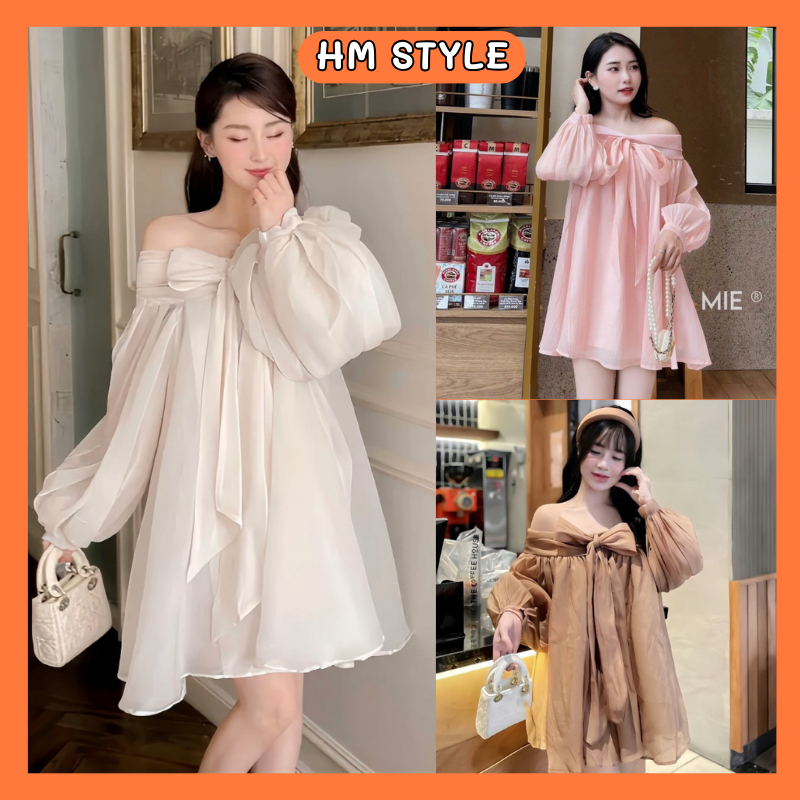 Váy babydoll trễ vai nơ ngực chất voan tơ 2 lớp mềm mại, đầm bánh bèo tiểu thư xinh xắn mã HV379 Thời Trang Center