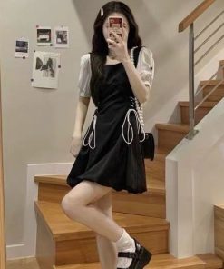 Váy chữ A tay trắng có dây nơ rút 2 bên xinh xắn Thời Trang Center